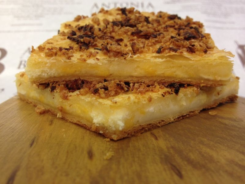 Sus ingredientes son ; hojaldre, 4 quesos ( de cabra, gouda, camembert, gouda y emmental) junto con la cebolla crujiente.