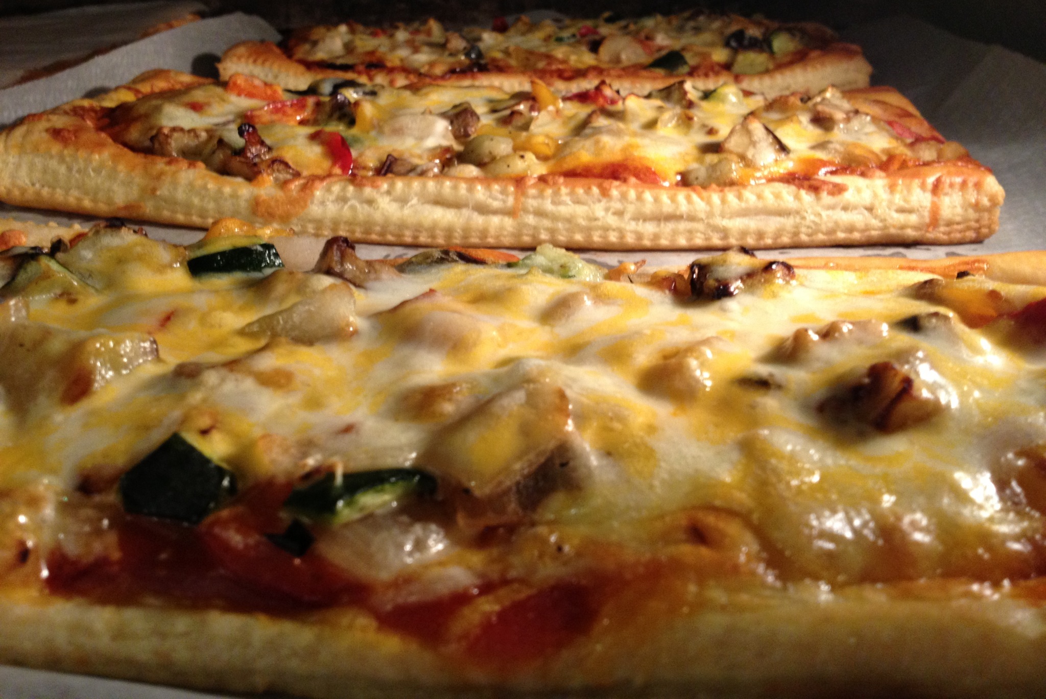 Sus ingredientes son; hojaldre, 4 quesos (gouda, cheddar, camembert, emmental), tomate y verduras braseadas.