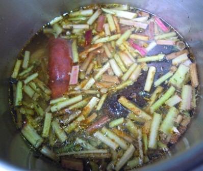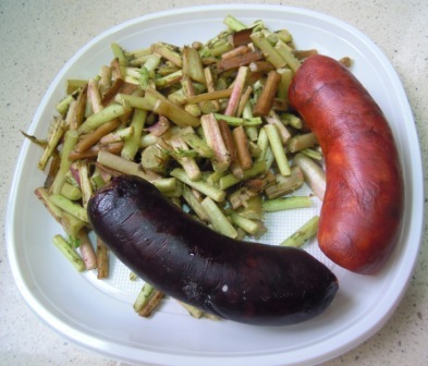 En la olla rápida ó exprés se echan las fabes ya remojadas, las tagarninas cortadas, el chorizo, la morcilla, sal, un poco de comino y una cucharada de pimentón dulce.