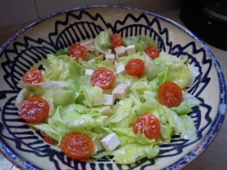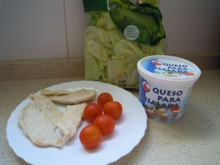 Con lechuga iceberg, tomatitos sherry, pollo a la plancha frío y taquitos de queso fresco.