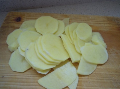 En una bandeja de horno se colocan unas patatas cortadas en rodajitas finas, con un poco de sal.