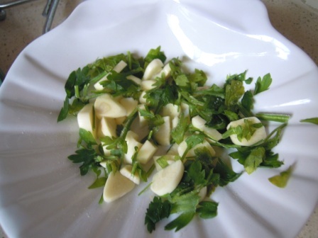 Se ponen las doradas sobre las patatas y se cubren con el refrito de ajo y perejil.