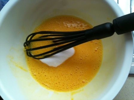 Batir los huevos, añadir el azúcar y mezclar bien.