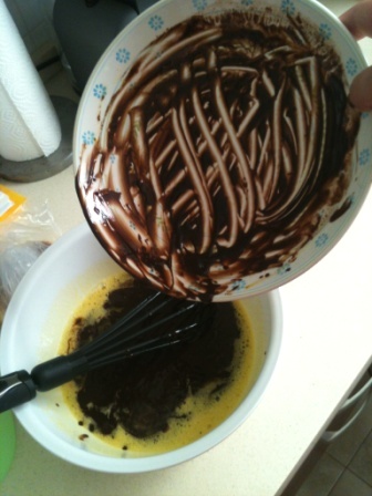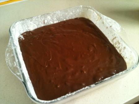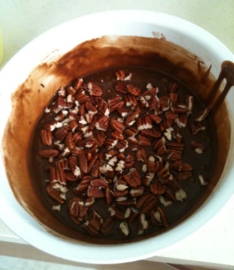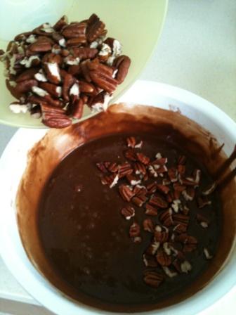 Añadir la leche, mezclar bien y a continuación el chocolate con la mantequilla. Seguir mezclando bien, añadir la harina con la levadura y, por último, las nueces.