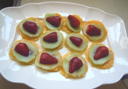 En una bandeja se colocan rodajas de naranjas, encima otras de kiwis y, por último, las fresas.