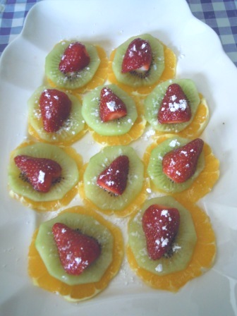 Este postre no tiene nada de especial, lo pongo como sugerencia de presentación de tres tipos de frutas que, combinadas, nos aportan una gran cantidad de vitamina C. Se trata del kiwi, la naranja y la fresa.