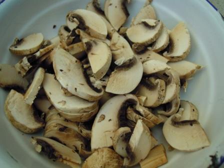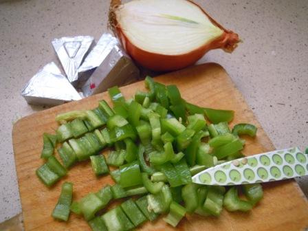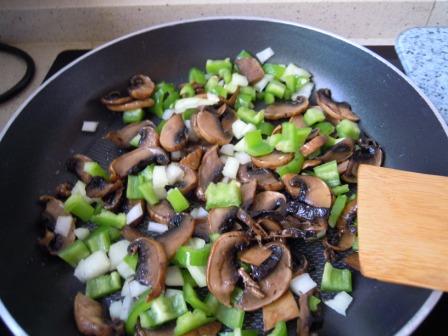 En primer lugar hacemos el relleno. Cortamos los champiñones en láminas, y la cebolla y los pimientos en trocitos pequeños.