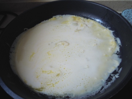 Echamos parte de la mezcla de forma que cubra la superficie pero quede fina. Cuando notemos que ya está hecha por una cara le damos la vuelta y dejamos que se haga por el otro lado.