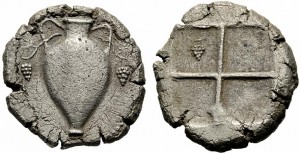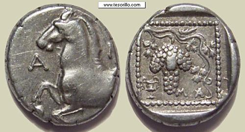 MetapontoO las de Macedonia con un ánfora, aludiendo a la riqueza de sus vinos.