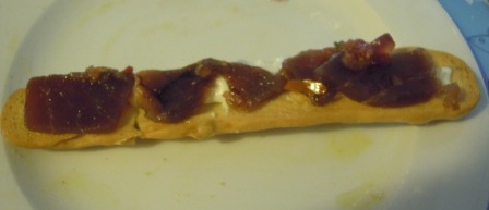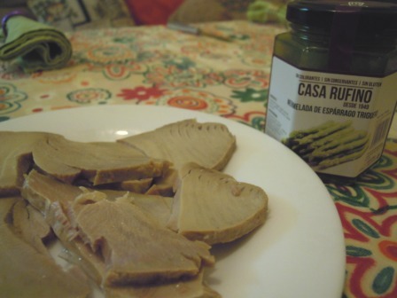 focacia 002Lomos de atún en aceite con una novedad, mermelada de espárragos trigueros de Casa Rufino, que también venden allí, aunque se fabrica en Huétor Tajar. La combinación, que ya había probado en la presentación que hizo Herpac en Arte Serrano hace pocos días, es exquisita.