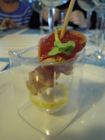 focacia 003focacia 009Una vez acabamos la visita nos fuimos a Zahara de los Atunes a disfrutar de su Ruta del Atún, y comimos en La Taberna de El Campero, una «sucursal» de El Campero de Barbate, pero dedicada más al tapeo y las raciones. Allí tomamos platos muy ricos de atún, pero quiero destacar  dos tapas elaboradas con motivo de la citada ruta. Un tataki de atún con ajo blanco, muy rico.