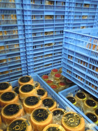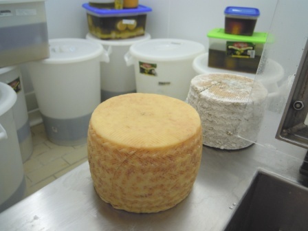 Allí estaban almacenados los diversos tipos de queso ya envasados, y unos quesos mucho más grandes, de 8 kgs. cada uno en peso original, de reciente creación.