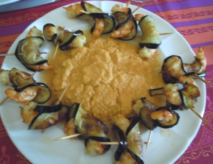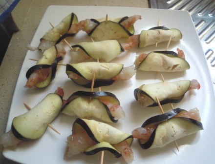 Se envuelve el gambón con una rodaja de berenjena y se une con un palillo.