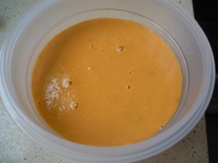 Hacemos el salmorejo poniendo en la batidora los tomates pelados, el pimiento cortado, el ajo, un buen trozo de pan del dia anterior, sal y un buen chorro de aceite de oliva. Se bate todo bien en la batidora.