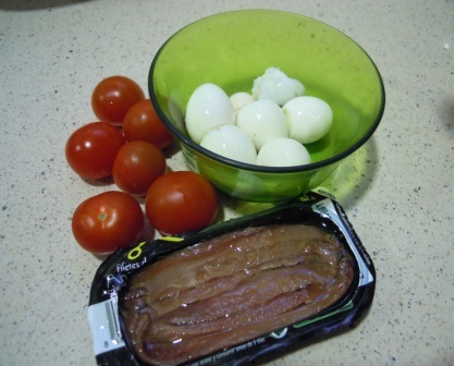 Se colocan sobre las judías los tomatitos, los huevos y las anchoas, y lista para tomar.