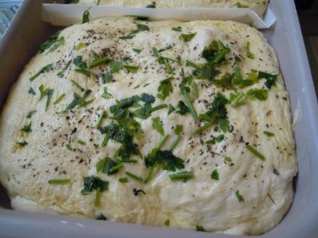 Adornar con impresiones de los dedos la superficie y poner sal gruesa, aceite y algunas hierbas.