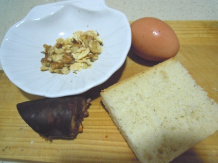 Picamos los frutos secos. Le quitamos la piel a la morcilla y la desmenuzamos.