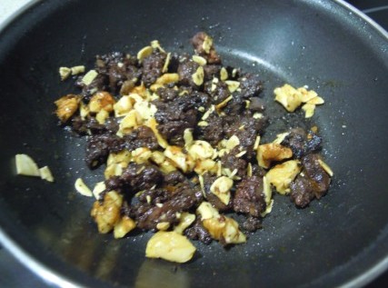 En una sartén ponemos un poquitín de aceite de oliva, y refreimos la morcilla, luego echamos los frutos secos.