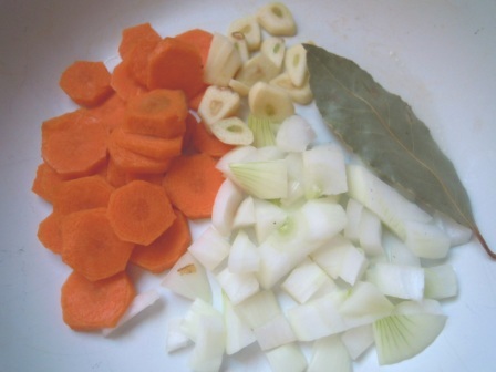 En la misma olla y con el resto del aceite se doran los ajos picados y la cebolla picada y se refríen un poco. Luego la zanahoria pelada y cortada en rodajitas, el laurel, el tomate, el caldo y el vino.
