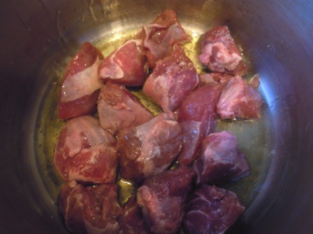 En una olla con aceite de oliva se echa la carne y se remueve. Se saca y aparta.