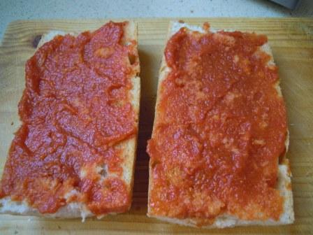 Hierro 002Se corta el pan por la mitad y se unta con tomate frito.