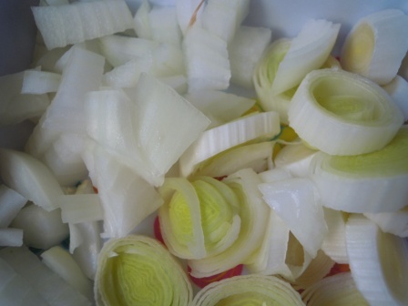 Picamos en trocitos el tomate, el pimiento, la cebolla y el puerro.