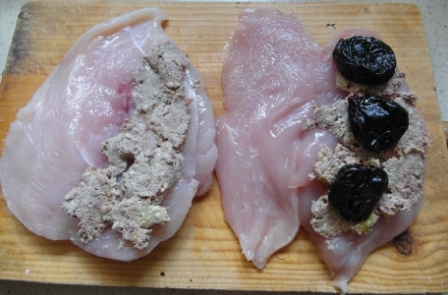 Se cortan por la mitad las pechugas sin llegar al final, dejándolas como un libro. Se unta una cara con paté o foiegrás, y encima se colocan tres ciruelas.