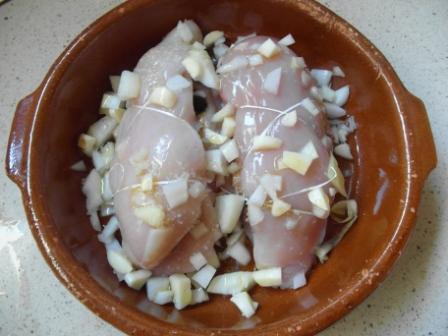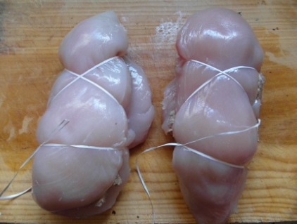 Se cierran las pechugas y se atan con hilo o cuerda de la que se usa para atar la carne. Se salan.