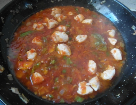 Refreir el ajo y la cebolla cortaditos, añadir los pimientos también cortaditos. A continuación la hoja de laurel y el tomate. Refreir todo. Añadir el pollo y refreir un poco más.