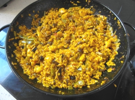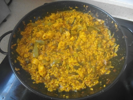 Para hacerlo recordamos todo lo aprendido en el curso de arroces que nos impartió en Rota Antonio Fernández Laynez en su bar- restaurante Diverso, curso en el que tuvimos la oportunidad de participar y aprender muchisimo. Por ejemplo cómo echar el arroz formando una línea diagonal antes del caldo. Y que si queremos un arroz meloso el arroz debe estar a ras del caldo, si lo queremos caldoso por debajo del caldo, y si lo queremos seco por encima del caldo. Bueno, pues manos a la obra.