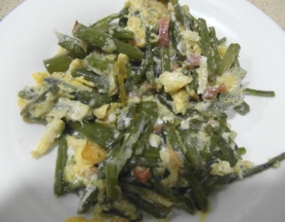 En una sartén echamos un chorro de aceite y refreimos el ajo picadito, luego echamos las tagarninas y refreimos todo. Cuando esté refritito añadimos el jamón cortado en trocitos y los huevos.
