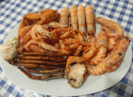 Degustamos unos magníficos mariscos, langostinos, gambas, bocas, patas de cangrejos, cigalas, quisquillas…Todo estaba muy fresco y muy bien cocido, en su punto justo de cocción y sal.