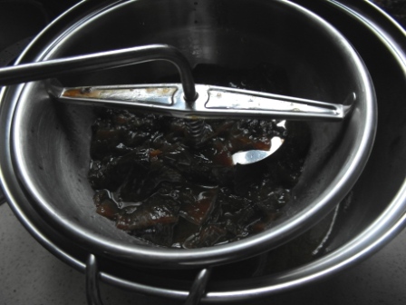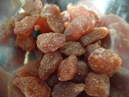En un cuenco con coñac echamos las frutas secas durante una hora para que se esponjen y cojan sabor.