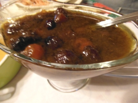 Y tenía arándanos y ciruelas que había comprado en Mercadona. Así que mezclé la salsa que suelo hacer para guisar carne con mucha cebolla, ajo y vino, con estas frutas. También se me ocurrió echar no el mismo vino sino mezclar varios, así que usé oloroso, vino dulce y coñac. Y puedo decir con satisfacción que me salió una salsa fabulosa.