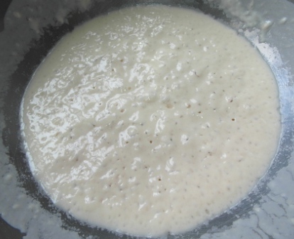 Para hacer la esponja o prefermento calentamos la leche a unos 33º (usamos un termómetro para saberlo). Añadimos la harina y la levadura, la tapamos con papel film y lo dejamos fermentar una hora, hasta que haga burbujas.