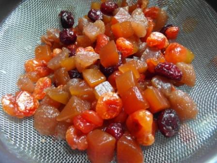 Ponemos a remojar las frutas en agua caliente para que se reblandezcan. Cuando lo estén las colamos y ponemos en un cuenco con el zumo de naranja y el licor, para macerarlas.