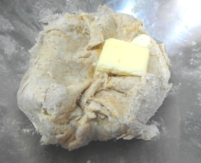 Añadimos la esponja o prefermento, el huevo, la mantequilla y agua hasta obtener una bola blandita pero no pegajosa.