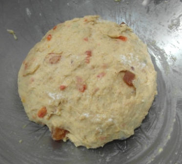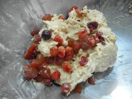 A la masa le añadimos la fruta y los pistachos incorporándo todo, que quede bien mezclado.
