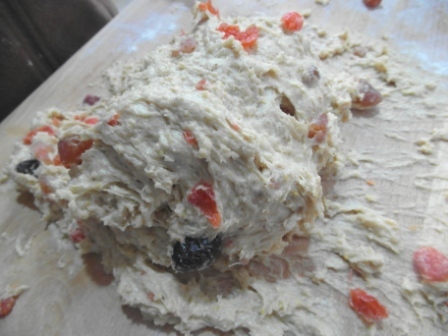 Echamos harina sobre la mesa o tabla donde vayamos a amasar, amasamos hasta que la fruta quede bien mezclada y conseguir una masa suave y brillante.