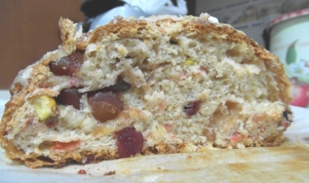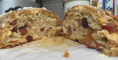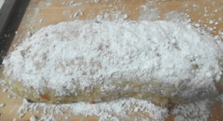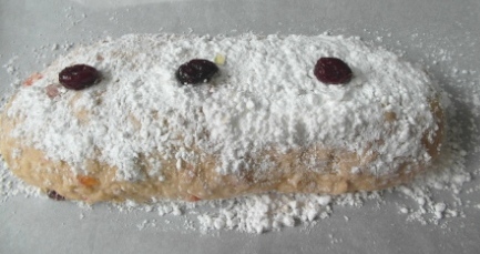 Esta receta la ví en el libro de Peter Reinhart El aprendiz de panadero. La foto me llamó la atención y con la misma fruta que había comprado en Makro y Mercadona, que había usado para la salsa del roti de pavo, me puse manos a la obra. El stollen es un pan dulce muy popular en Alemania durante la Navidad. El más famoso es el de Dresde, pero se hace en otras ciudades como Westfalia, Colonia, Bremen…aunque solo Dresde tiene la denominación de origen.