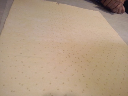 Una nueva modalidad de hojaldre elegida fue la quiche. Forramos un molde rectangular con una lámina de hojaldre y cortamos lo que sobraba.