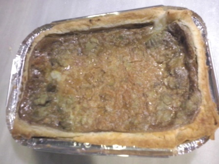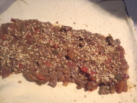 Todos los rellenos eran novedosos, no los han vendido hasta ahora en las tiendas, estaban hechos para esta ocasión, de tal manera que probábamos los sabores para incluirlos en futuros productos puestos a la venta. El primer relleno era de carne picadita con cacahuetes molidos y aromatizada con tomillo y romero. Estaba exquisito, con un sabor especiado buenísimo. Con él rellenamos una empanada, cuyo hojaldre ya estaba preparado, y la rellenamos, decoramos y horneamos entre todos.