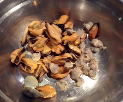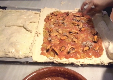 Les quitamos las «cáscaras» a los mejillones y almejitas, que iban a formar el relleno de otra empanada.