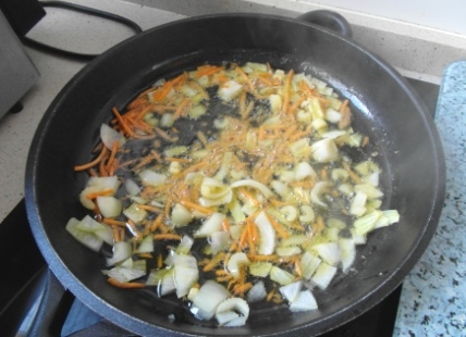 Limpiamos y cortamos la cebolla, el apio, el ajo y la zanahoria. Lo refreimos en una sartén con un poco de aceite. Le añadimos un poquitín de sal.