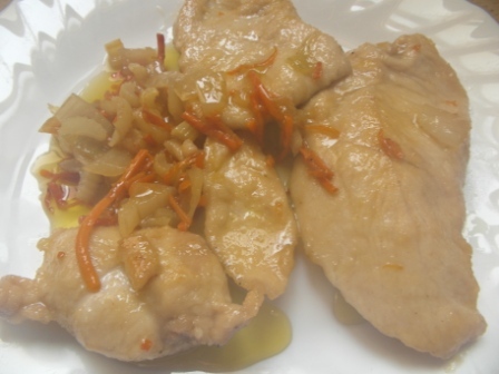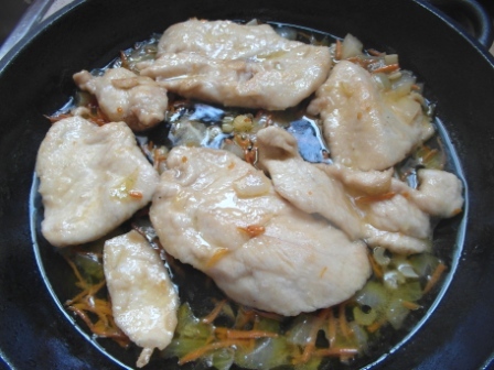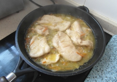 Enharinar los filetes y echarlos en la sartén con las verduras. Dejarlos hacer unos minutos hasta que se pongan tiernos, cosa que ocurrirá en muy poco tiempo.