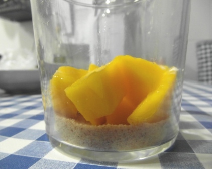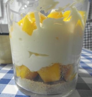 Ahora llega el momento de montar el postre. En la parte inferior del vaso echamos galletas, encima mango, sobre éste crema de yogur y queso, y de nuevo mango para acabar con crema.