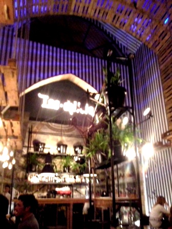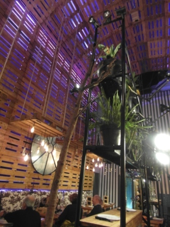 La altísima bóveda ha sido recubierta con palés de madera, y también de palés cuelgan las originales bombillas. Han conservado el andamio que sirvió para la construcción y lo han llenado de plantas.