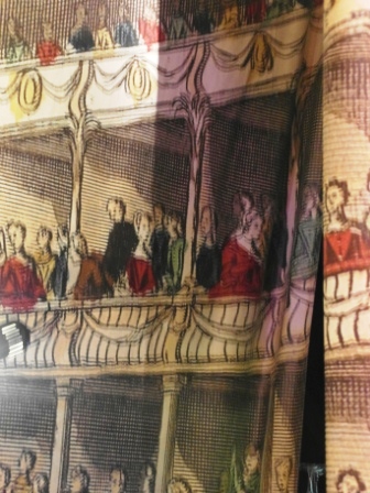 El antiguo escenario es la barra, flanqueada por cortinas que simulas palcos de teatro con sus espectadores y todo. Como un trampantojo.