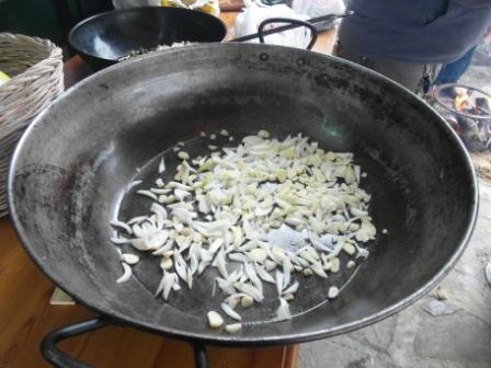 En una sartén o perol se rehogan la cebolla, el ajo y una hoja de laurel.