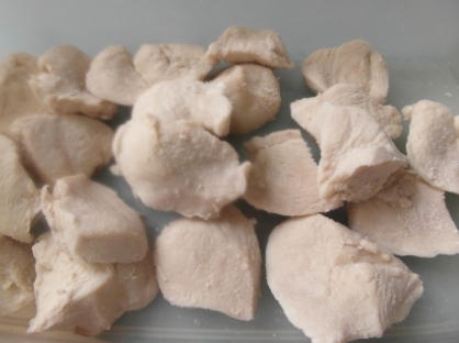 Cortamos el pollo en trocitos y los cocemos en agua con sal. Los escurrimos.